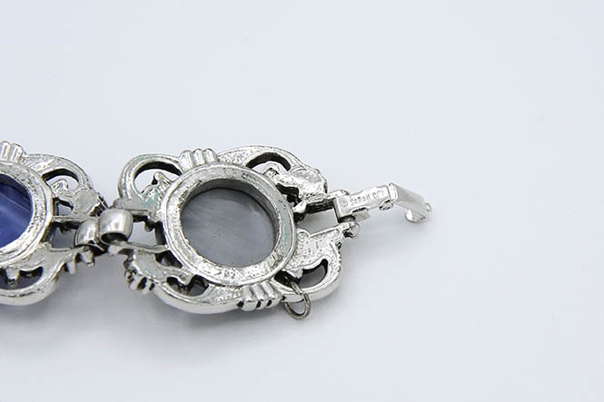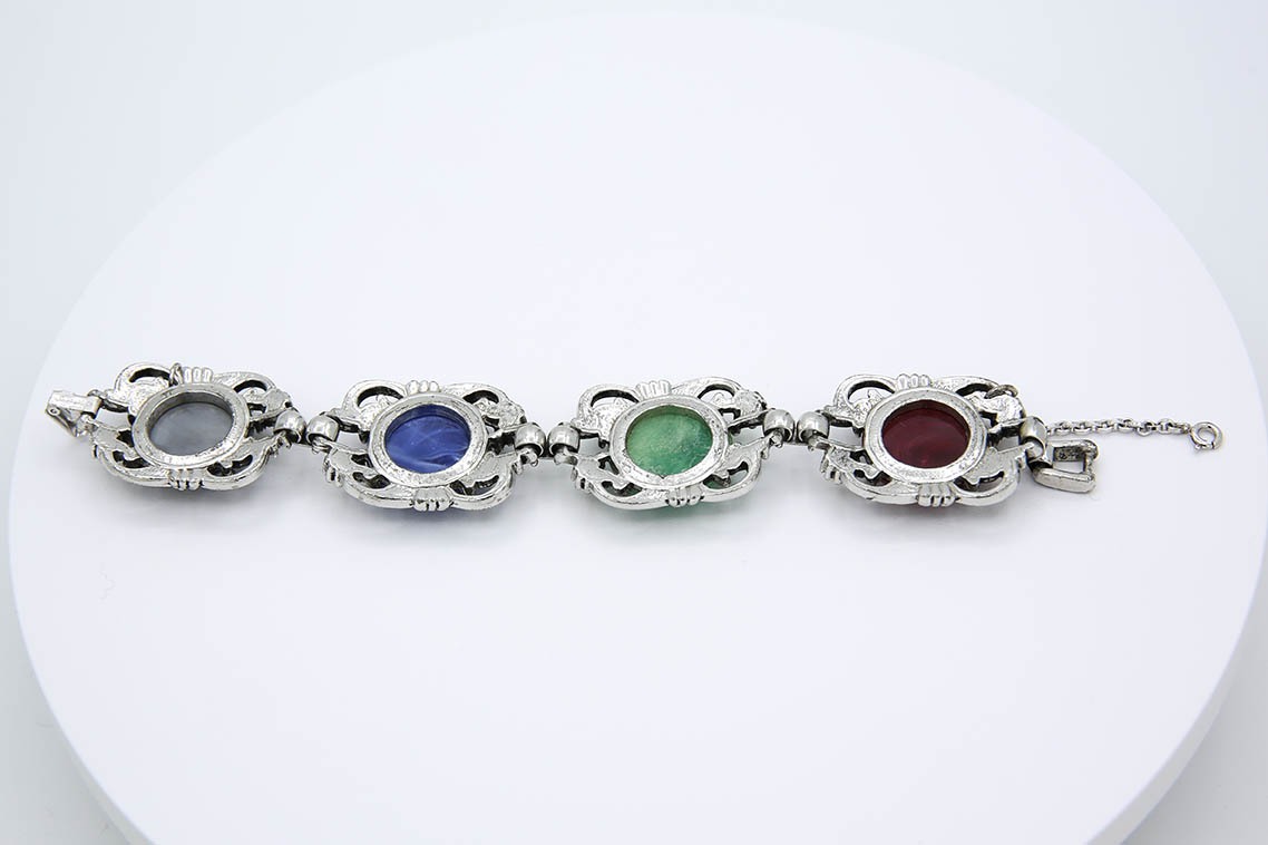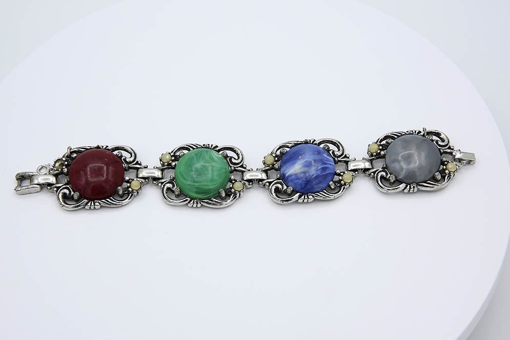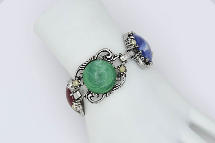 1957 Fiesta Bracelet. Silver tone bracelet with multi colored stones and faux pearls. this particular bracelet is missing 1 of the faux pearls.