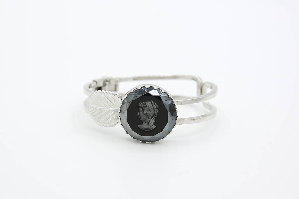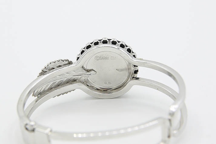 1971 Intaglio Bracelet . Recently identified in the 1971 Scotland catalog as a Hostess Bonus item! This one is missing a leaf on the right side. Signed "SARAH COV" and "G.B.". Measures about 2-1/2" in diameter.